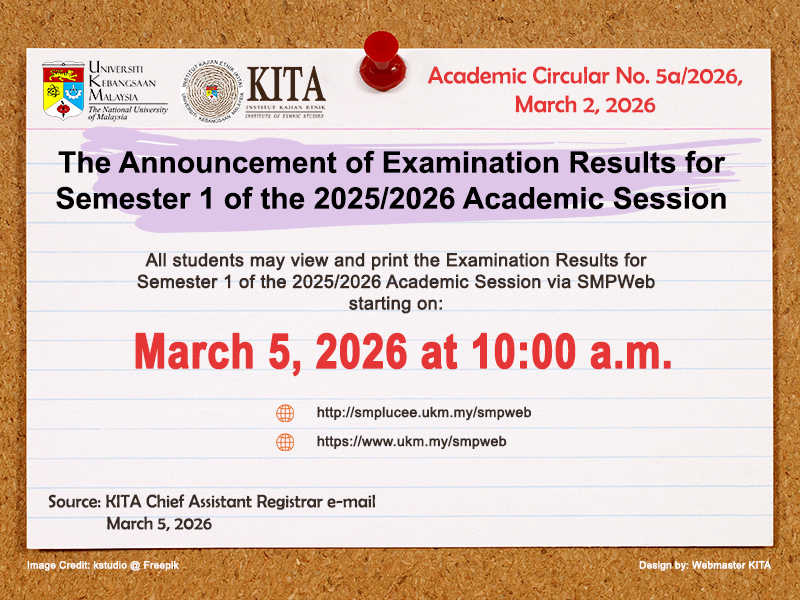 Academic UKM Circular No. 5a/2026: The Announcement of Examination Results for Semester 1 of the 2025/2026 Academic Session, March 2, 2026 Loading… Taking too long? Reload document | Open in new tab Download [228.25 KB]