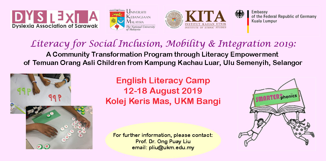 The organising team of KITA-UKM and DASwk would like to express its heartfelt thanks, gratitude and appreciation to all the funders – The Edge KL Rat Race 2017 (2018), Embassy of the Federal Republic of Germany, Kuala Lumpur (2019) and Minister of National Unity and Social Well-being, Prime Minister’s Department (2019); our supporters – Jabatan Kemajuan Orang Asli [JAKOA], Multimedia University Melaka, Kem PLKN Millennium, Beranang, Selangor, Kolej Dato Onn, UKM Bangi, Kolej Keris Mas, UKM Bangi, Tok Batins and all parents and children from participating Orang Asli villages as well as donors, facilitators and helpers.