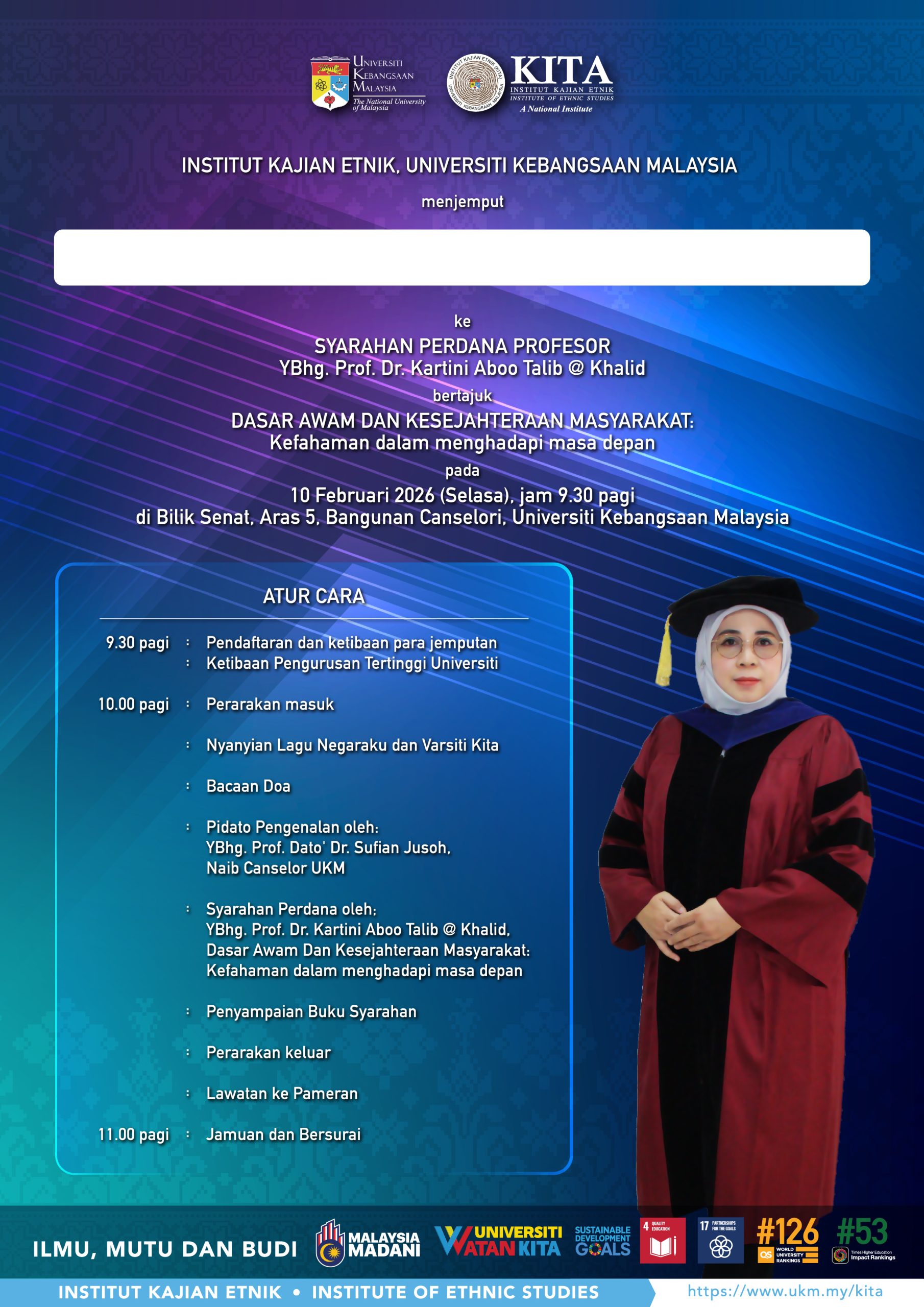The Institute of Ethnic Studies (KITA) cordially invites you to the Inaugural Professorial Lecture by KITA Principal Research Fellow Prof. Dr. Kartini Aboo Talib @ Khalid, to be held as follows: