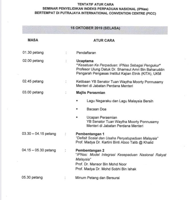 Adalah dimaklumkan KITA dengan kerjasama Jabatan Perpaduan dan Integrasi Nasional di bawah Jabatan Perdana Menteri akan menganjurkan Seminar Penyelidikan Indeks Perpaduan Nasional dengan ketetapan berikut: