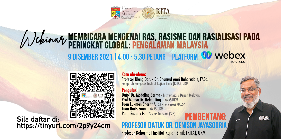 Dengan hormatnya dimaklumkan bahawa Institut Kajian Etnik (KITA-UKM) akan menganjurkan webinar yang membicarakan mengenai Ras, Rasisme dan Rasialisasi Pada Peringkat Global : Pengalaman Malaysia. Prof. Datuk Dr. Denison Jayasooria akan membentangkan perbincangan mengenai isu ini dengan penampilan khas Profesor Ulung Datuk Dr. Shamsul Amri Baharuddin selaku moderator.