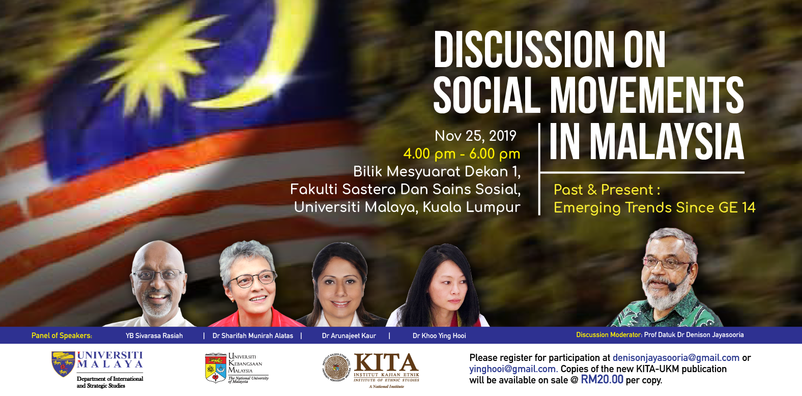 Bilik Mesyuarat Dekan 1, Faculty of Arts and Social Sciences (FASS) Universiti Malaya, Kuala LumpurInstitute of Ethnic Studies (KITA-UKM) and Department of International and Strategic Studies, Universiti Malaya, cordially invite you to Discussion on Social Movements in Malaysia on ...