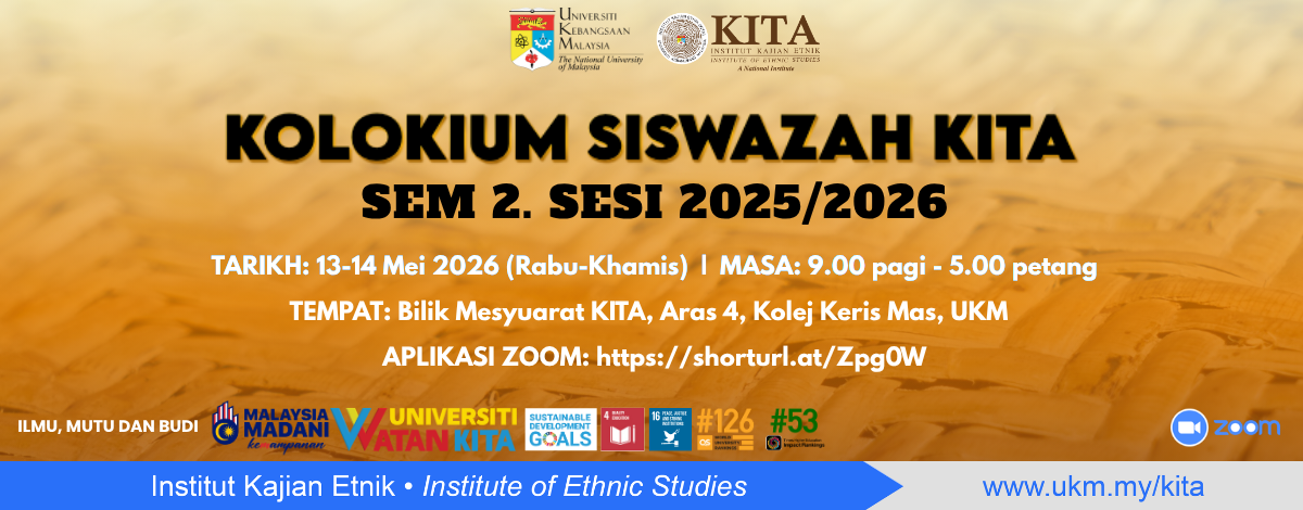 FeaturedKITA Meeting Room Universiti Kebangsaan Malaysia (UKM), Bangi, Selangor, MalaysiaGreetings to all postgraduate students and members of KITA. KITA Postgraduate Colloquium for Semester 2 of 2025/2026 Academic Session will be held with the following ...