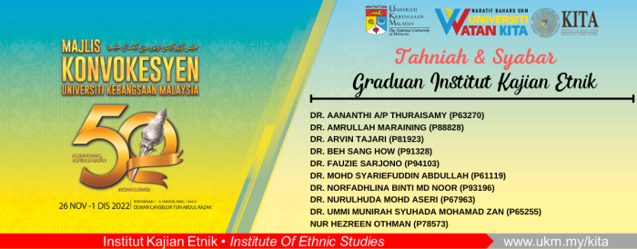 Universiti Kebangsaan Malaysia (UKM) conducted its 50th Convocation Ceremony from 26 November – 1 December 2022. During this auspicious occasion, a total of ten postgraduate students from KITA received their scrolls: