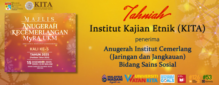 Tahniah buat Institut Kajian Etnik (KITA) atas kejayaan merangkul Anugerah Institut Cemerlang bagi kategori Jaringan dan Jangkauan dalam Bidang Sains Sosial seperti mana yang diumumkan pada Majlis Anugerah Kecemerlangan MyRA® UKM kali ke-5 (Prestasi Tahun 2024) yang telah berlangsung pada 15 Disember 2025 di DECTAR, UKM.