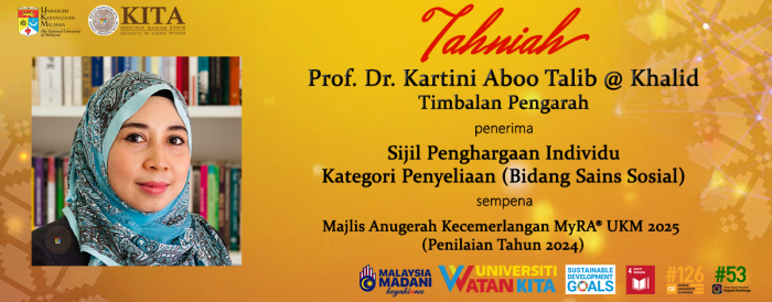 - Kategori Penyeliaan (Bidang Sains Sosial): Prof. Dr. Kartini Aboo Talib @ Khalid