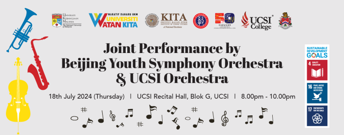 18 Julai 2024 – Bersempena dengan ulang tahun ke-50 hubungan diplomatik Malaysia-China, UCSI University di Kuala Lumpur telah menjadi tuan rumah bagi persembahan bersama antara UCSI Institute of Music dan Beijing Youth Symphony Orchestra, yang terdiri daripada pelajar sekolah dari pelbagai sekolah di China. Acara ini dianjurkan secara bersama oleh Institut Kajian Etnik (KITA) dari Universiti Kebangsaan Malaysia (UKM), UCSI University, Persatuan Pertukaran Persahabatan Pengajian Tinggi Malaysia-China, Dewan Bandaraya Kuala Lumpur, serta disokong oleh sembilan organisasi lain. Objektif acara ini adalah untuk meraikan ulang tahun ke-50 hubungan diplomatik antara Malaysia dan China, mempromosikan muzik dan budaya kedua-dua negara, dan memperkenalkan Malaysia sebagai hab pelajar antarabangsa. UCSI Institute of Music, yang menduduki kedudukan ke-42 dalam QS World University Ranking 2024 untuk seni persembahan, diwakili oleh 40 pelajar, manakala Beijing Youth Symphony Orchestra mempersembahkan lima persembahan dan UCSI Institute of Music menyusul dengan tujuh persembahan. Antara tetamu kehormat yang hadir termasuk Pengarah Pengasas KITA Prof. Ulung Datuk Dr. Shamsul Amri Baharuddin, Timbalan Pengarah KITA Prof. Dr. Kartini Aboo Talib @ Khalid, Pengerusi Eksekutif UCSI Dato’ Peter Ng dan ADUN Kajang YB Tuan Cheong Kian Young.