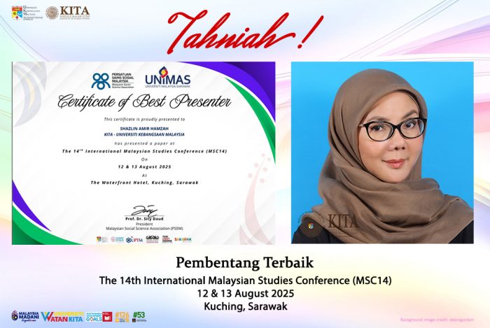 Congratulations to KITA Research Fellow Dr. Shazlin Amir Hamzah whose presentation on “Reimagining national identity: patriotic songs, music education, and nation-building in Malaysia” was selected as Best Presenter in the 14th International Malaysian Studies Conference (MSC14) that took place at the Waterfront Hotel, Kuching, Sarawak on 12 & 13 August 2025.