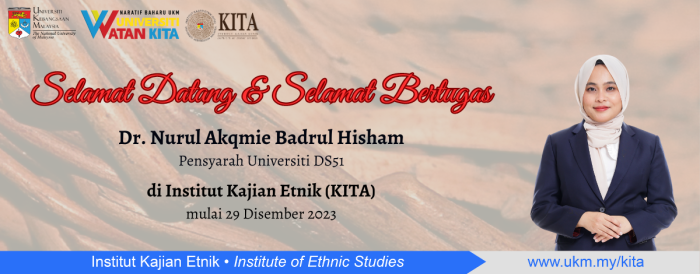 Sukacita dimaklumkan bahawa KITA telah menerima kakitangan baharu Dr. Nurul Akqmie Badrul Hisham sebagai Felo Penyelidik di KITA berkuatkuasa mulai 29 Disember 2023. Seluruh warga KITA mengucapkan selamat datang dan selamat menjalan tugas buat Dr. Akqmie.