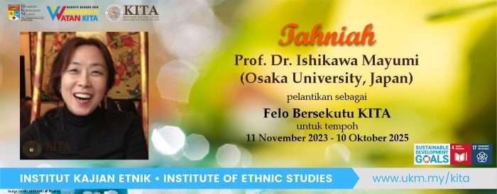 Sekalung tahniah  kepada Prof. Dr. Ishikawa Mayumi dari Osaka University, Japan, atas pelantikan sebagai Felo Bersekutu KITA selama dua (2) tahun mulai 11 November 2023.