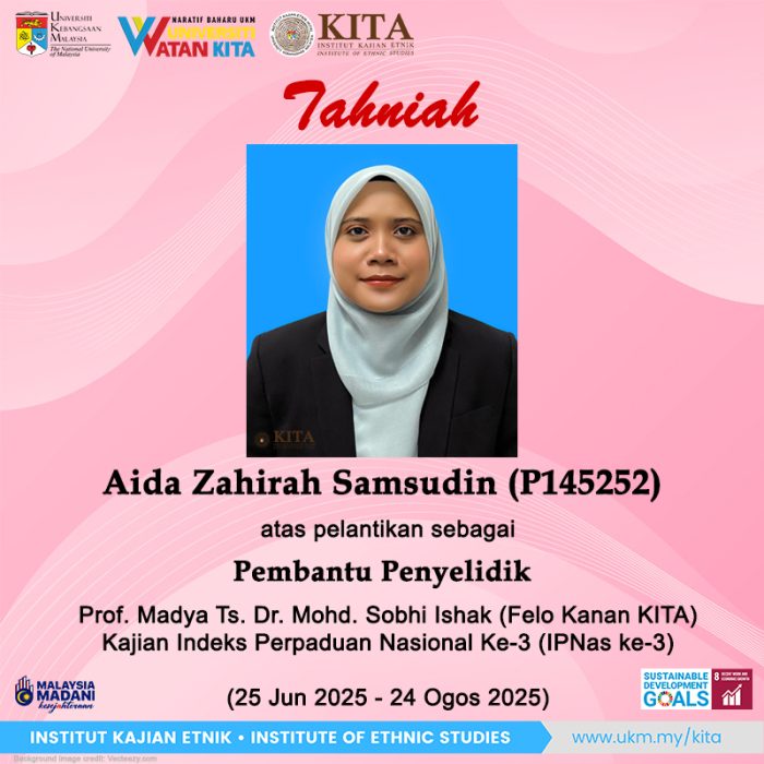 Tahniah buat Sdri Aida Zahirah Samsudin (P145252) yang juga merupakan calon program Doktor Falsafah (Pengajian Etnik) di KITA, atas pelantikan sebagai Pembantu Penyelidik bagi Kajian Indeks Perpaduan Nasional ke-3 (IPNas ke-3) bagi tempoh 2 bulan (25 Jun – 24 Ogos 2025).