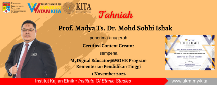 Tahniah buat Penyelidik Kanan KITA Prof. Madya Ts. Dr. Mohd. Sobhi Ishak atas pengiktirafan sebagai ‘Certified Content Creator’ sempena MyDigital Educator @ MOHE Program pada 1 November 2022.