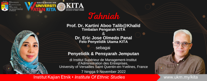 Tahniah Timbalan Pengarah KITA Prof. Dr. Kartini Aboo Talib @ Khalid dan Felo Utama KITA Dr. Eric Olmedo Panal atas sangkutan sebagai Penyelidik dan Pensyarah Jemputan di Institut Supérieur de Management-Institut d’Administration des Entreprises, University of Versailles Saint Quentin-en-Yvelines, Perancis, dari 7hb hingga 9hb November 2022.