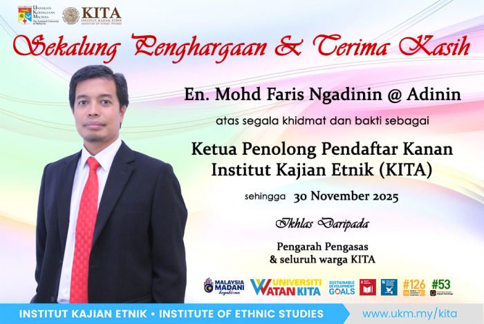 Seluruh warga KITA-UKM ingin mengucapkan jutaan terima kasih dan setinggi-tinggi penghargaan buat Ketua Penolong Pendaftar Kanan KITA En. Mohd Faris Ngadinin @ Adinin atas segala perkhidmatan cemerlang dan sumbangan yang telah diberikan sepanjang tempoh perkhidmatan beliau di KITA-UKM selaku Ketua Pentadbiran dari 17 Januari 2022 hingga 30 November 2025, yang akan bertukar ke Bahagian Sumber Manusia (BSM), Jabatan Pendaftar UKM mulai 1 Disember 2025. Semoga beliau akan meneruskan perkhidmatan yang cemerlang di tempat baharu dan selamat maju jaya.