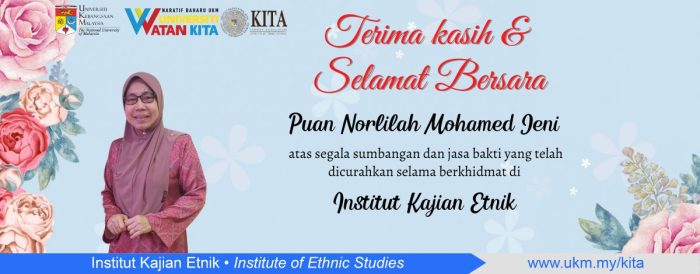 Selamat Bersara diucapkan kepada Pn. Norlilah Mohamed Jeni, Setiausaha kepada Pengarah Pengasas KITA yang bersara pilihan pada 30 Disember 2023 setelah berkhidmat selama 35 tahun di UKM. Beliau mula berkhidmat di Jabatan Persuratan Melayu diikuti dengan Jabatan Bendahari dan seterusnya 18 tahun di Canselori sebelum ke KITA pada 4 Julai 2022 (1 tahun 6 bulan).