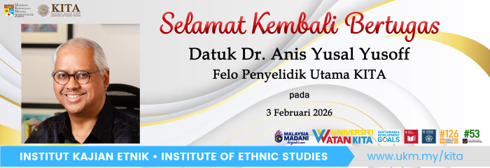 Seluruh warga Institut Kajian Etnik (KITA) mengucapkan selamat kembali bertugas buat Felo Penyelidik Utama KITA Datuk Dr. Anis Yusal Yusoff setelah tiga tahun dipinjamkan ke Universiti Malaya (UM) sebagai Pengarah Pusat Kepimpinan dan Pembaharuan (UMLEAD) dari 2 Februari 2023 hingga 1 Februari 2026.
