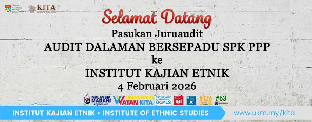 Quality Assurance Scope Studies and Services Management Quality Management System (SPKPPP):Master in Ethnic Studies ProgrammeDoctor of Philosophy (Ethnic Studies) Programme KITA Quality Assurance Committee* Head of Quality Assurance:Dr. Nur Atiqah Tang AbdullahPostgraduate Program Coordinator:Dr. Shazlin Amir HamzahCommittee Members:Dr. Noor Atika Shafinaz NazriDr. Mohd Shaiful Ramze EndutDr. Nurul Akqmie Badrul HishamDr. Pue Giok HunPn. Nor Eloni Nor AzmiPn. Noorrulhawa Abu BakarPn. Nur Hezreen OthmanPn. Nur Aimuni Othman*Term of appointment may vary for each individual. Past Activities Audit Dalaman Bersepadu SPK PPP UKM 2026 di KITA, 4 Februari 2026 Pelantikan Penyelaras Program Siswazah KITA, 1 November 2025 Pelantikan Ketua Jaminan Kualiti KITA, 1 November 2025 Audit Penilaian Kendiri SPKPPP KITA, 30 September 2025 Bengkel Audit Kendiri Bersama KUALITI-UKM, 23 Julai 2025 Bengkel Permohonan Program Akademik Baharu Bersama PENGAJARAN-UKM, 11 Julai 2025 Pelantikan Semula Penyelaras Program Siswazah KITA, 1 April 2025 Audit Pengawasan SIRIM SPK PPP 2023, 11 Julai 2023 Audit Dalaman Bersepadu SPK PPP 2023, 2 Jun 2023 Pelantikan Ketua Jaminan Kualiti KITA, 1 November 2022 Sekalung penghargaan: Dr. Adil Johan, Ketua Jaminan Kualiti KITA (1 November 2017-31 Oktober 2022) Pelantikan Penyelaras Program Siswazah KITA, 1 April 2022