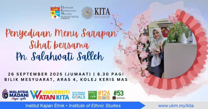 SDG 3 – Good Health and Well-Being Ensure healthy lives and promote well-being for all at all ages. 2025 Majlis Bacaan Yassin & Tazkirah Ramadhan KITA, 28 Februari 2025 Perbincangan kajian lanjutan Indeks Kesejahteraan Penerima Bantuan Sosial (IKPBS), 21 Mei 2025 Program kitar semula lulur beras, 25 September 2025 Program Menu Sarapan Sihat, 26 September 2025 2024 Program 'Berhenti Sekejap! Permainan Tradisional Edisi Pejabat', 21-24 Oktober 2024 Hands-on traditional culinary (karipap) with Sciences Po (France) students, 6 November 2024 Hands-on deepavali kolam decorative rice art with Sciences Po (France) students, 30 October 2024 Johan Pertandingan Menghias Pejabat sempena Bulan Kemerdekaan ke-67, 30 Ogos 2024 Pelantikan sebagai Pakar Rujuk Bengkel Validasi Kajian Indeks Belia Malaysia (IBM) dan Indeks Budaya Sukan Malaysia (IBSM), 4 Julai 2024 Jalan Santai KITA Sihat, 17 Mei 2024 The Ulam School project, 2019-2024 2022-2023 Perjalanan Ilmu@KITA UKM Sempena Minggu Keselamatan & Kesihatan Pekerjaan, 22 Ogos 2023.