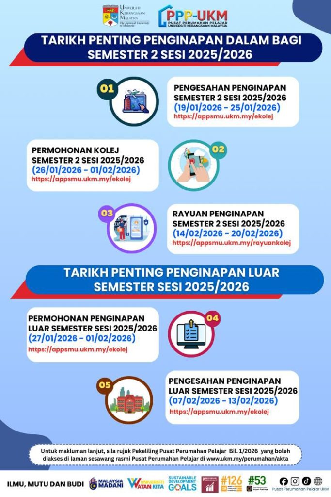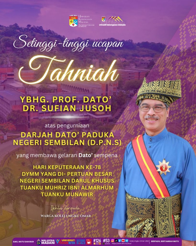Warga Kolej Ungku Omar ingin mengucapkan setinggi-tinggi ucapan tahniah kepada YBhg. Prof. Dato’ Dr. Sufian Jusoh, Naib Canselor Universiti Kebangsaan Malaysia (UKM) atas pengurniaan Darjah Dato’ Paduka Negeri Sembilan (D.P.N.S) yang membawa gelaran Dato’ sempena Hari Keputeraan yang ke-78, Duli Yang Maha Mulia Yang di-Pertuan Besar Negeri Sembilan Darul Khusus Tuanku Muhriz Ibni Almarhum Tuanku Munawir, Canselor Universiti Kebangsaan Malaysia (UKM) pada 14 Januari 2026, bersamaan 24 Rejab 1447H.