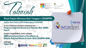 30 Jan 2026 – Tahniah! Pusat Kajian Bencana Asia Tenggara (SEADPRI) di atas kelulusan penilaian pembaharuan Program Integrated Research on Disaster Risk (IRDR) Fasa II dengan mengekalkan status sebagai IRDR International Centre of Excellence on Disaster Risk and Climate Extreme (ICoE-SEADPRI-UKM) sehingga tahun 2031.