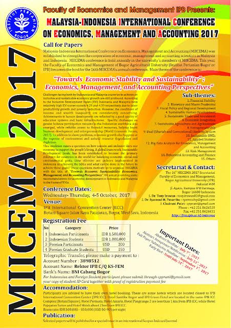 Researchers, post-graduate students, practitioners and policy makers are pleasantly invited to present their research results, papers, research proposals and/or participate as observers in the 16th Malaysia-Indonesia International Conference on Economics, Management and Accounting (MIICEMA).