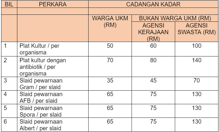 Perincian harga sebenar akan diberikan di dalam sebut harga bergantung kepada jenis mikroorganisma dan slaid pewarnaan.