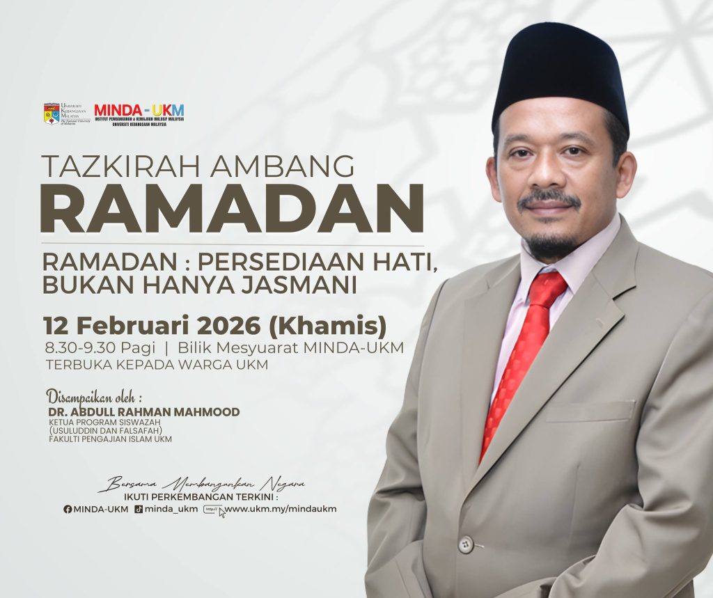 Ramadan tidak sekadar hadir sebagai musim ibadah, tetapi sebagai detik yang menggoncang kesedaran dan meluruskan kembali arah jiwa. Semangat inilah yang mendasari Tazkirah Ambang Ramadan bertajuk “Ramadan: Persediaan Hati, Bukan Hanya Jasmani” yang berlangsung pagi tadi secara fizikal dan atas talian bersama Dr. Abdull Rahman Mahmood (Pusat Kajian Usuluddin dan Falsafah, Fakulti Pengajian Islam, UKM). Perkongsian beliau menegaskan bahawa Ramadan ialah madrasah pembinaan dalaman; menyusun disiplin rohani, memperbetulkan niat kepimpinan dan memperkukuh integriti dalam setiap gerak kerja berpasukan. Di tengah arus kesibukan dunia dan tuntutan besar membangunkan negara, MINDA UKM tidak pernah memisahkan agenda pembangunan daripada pembinaan iman.