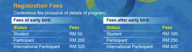 All those interested to participate in MPIC 2021 are required to register online at the conference’s website: http://www.ukm.my/mpic/ Registration Fees (inclusive of attendance to all talks, conference materials, lunches and refreshment)