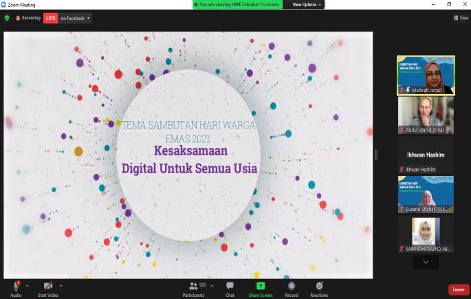 “Golongan dewasa yang bekerja diperkenalkan dengan platform zoom, ms team, webex dan sebagainya bagi melancarkan aktiviti bekerja dari rumah. Tidak ketinggalan, warga emas juga mendapat pendedahan yang sama dalam menjalani kehidupan seharian,” katanya semasa menyampaikan ucapan pada Majlis Sambutan Hari Warga Emas 2021, baru-baru ini.