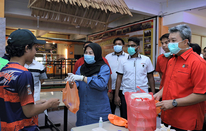Dato’ Dr. Noraini turut berkesempatan melihat pengurusan pengagihan bantuan daripada Food Bank Malaysia. Beliau turut menyumbang keperluan harian kepada pelajar dan menyerahkan sumbangan cek berjumlah RM3,000 daripada CEO EMGS kepada UKM untuk disalurkan kepada pelajar yang berada di kampus sepanjang tempoh MCO.