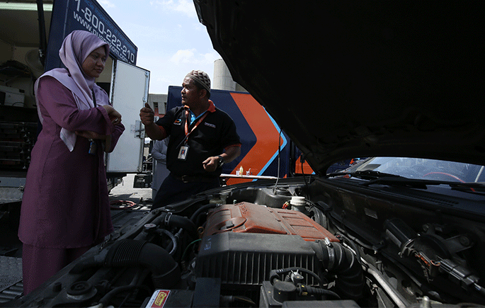 Antara pemeriksaan yang dijalankan ialah pemeriksaan keempat-empat tayar, cermin sisi dan cermin memandu, bahagian dalam enjin dan cukai jalan.![]()
