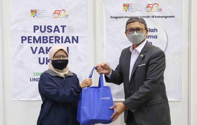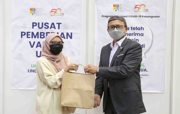 Selain itu, Nurhidayah Hasnul, penerima vaksin ke 99,999 dan Fatin Fasihah Mohd Ilkham, penerima vaksin ke 100,001 juga turut menerima cerderamata dari UKM sebagai tanda penghargaan dan kenang-kenangan.