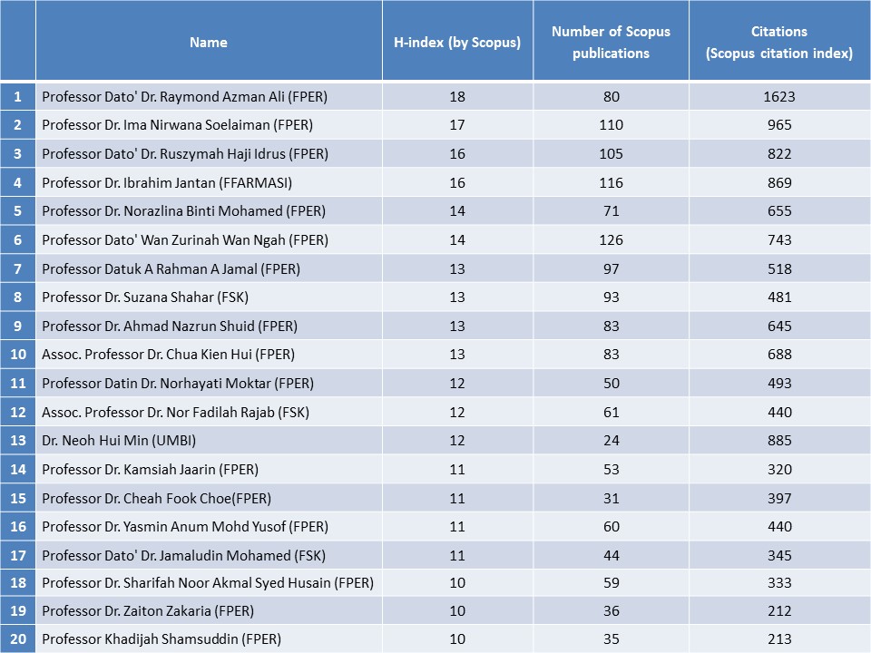 [11.8.2015] Top 20 researchers from the Faculty of Medicine, Faculty of Health Sciences, Faculty of Dentistry, Faculty of Pharmacy and UMBI ***Data as of 27th July 2015