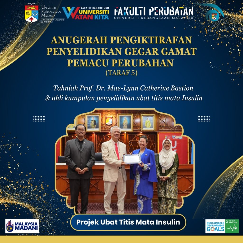 Jabatan ingin merakamkan setinggi-tinggi tahniah kepada Prof. Dr. Mae-Lynn Catherine Bastion serta ahli kumpulan penyelidikan ubat titis mata Insulin atas penerimaan Anugerah Pengiktirafan Penyelidikan Gegar Gamat – Pemacu Perubahan (Taraf 5) di UKM Bangi!
