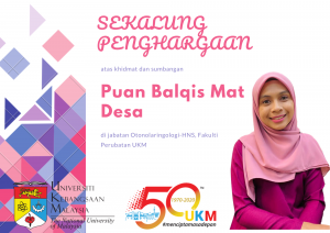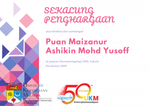 Sekalung penghargaan dan jutaan terima kasih diucapkan kepada 2 orang kakitangan di Jabatan Otorinolaringologi, Fakulti Perubatan UKM iaitu Puan Balqis Mat Desa & Puan Maizanur Ashikin Mohd Yusoff di atas sumbangan dan khidmat cemerlang yang diberikan sepanjang berada di Jabatan. Warga Jabatan Otorinolaringologi-HNS mengucapkan terima kasih dan selamat maju jaya di penempatan bertugas yang baru