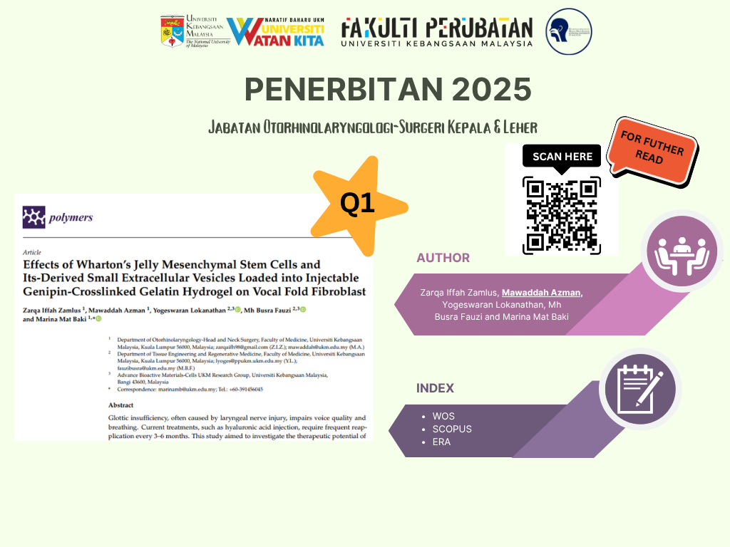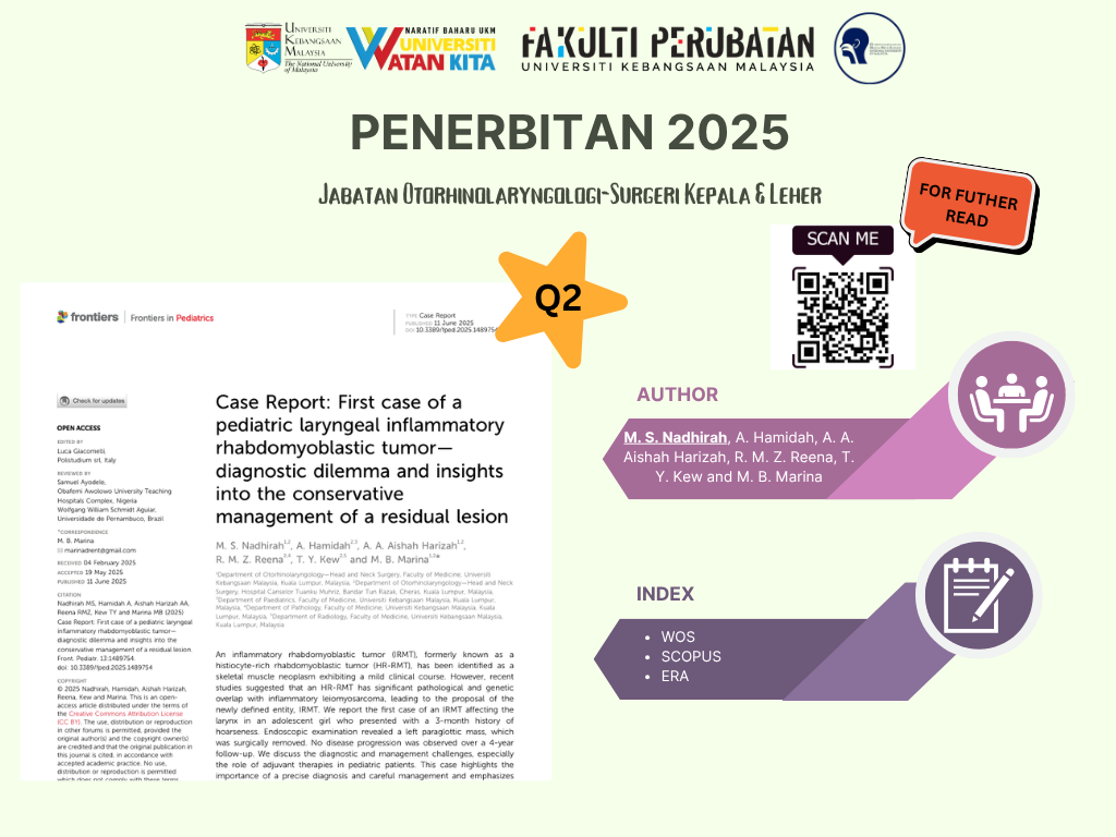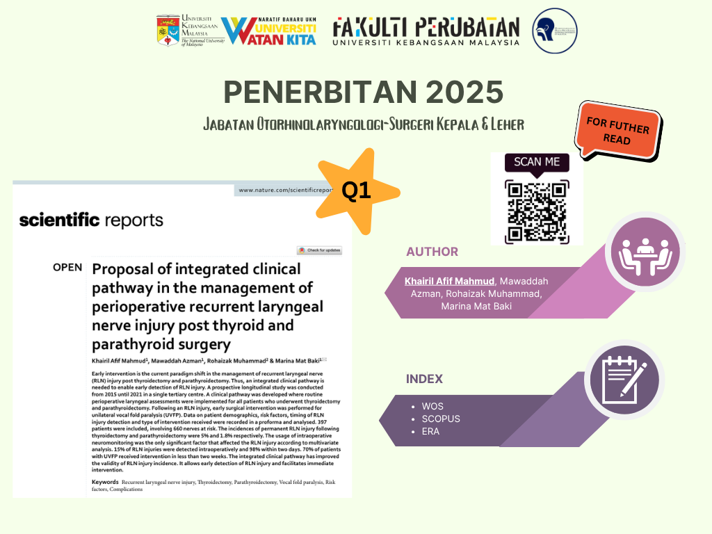 Tujuan Laporan ini bertujuan memaklumkan jumlah penerbitan oleh ahli akademik Jabatan Otorinolaringologi, Fakulti Perubatan yang telah disahkan dalam e-Repositori serta diindeks di pangkalan data Web of Science (WoS) dan Scopus bagi tahun 2021-2024