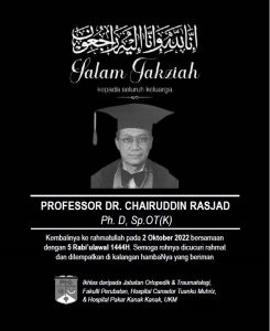Seluruh warga Jabatan Orthopedik & Traumatologi mengucapkan Salam Takziah kepada keluarga Allahyarham Professor Dr. Chairuddin Rasjad. Semoga rohnya dicucuri rahmat dan ditempatkan dikalangan hambaNya yang beriman.