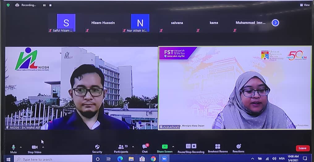 Webinar ini telah diadakan pada 2 Mac 2021 secara dalam talian menggunakan pelantar Zoom dan juga dipancarkan secara langsung melalui siaran FB Rasmi Fakulti Sains dan Teknologi. Kupasan topik pertama adalah berkenaan ‘Pengurusan Tempat Kerja Sihat dan Selamat ketika COVID – 19’ dan topik kedua adalah ‘COVID-19 : Tempat Kerja Masa Hadapan dan Impaknya kepada Manusia’. Antara ahli panel terdiri daripada Dr. Masdalina Azhari, Pegawai Perubatan, Pusat Kesihatan Universiti, UKM manakala ahli panel kedua adalah Assis. Prof. Dr. Mohammad Farhan bin Rusli, Pegawai Perubatan, Health Policy, Economics & Finance, Department of Community Health, Universiti Islam Antarabangsa Malaysia. Sementara itu topik ketiga pula bertajuk ‘Penerangan Ujian Saringan COVID-19 oleh UMBI’ dihuraikan oleh En. Mohd Raziff Alias, Pegawai Sains Kanan, Institut Biologi Molekul Perubatan UKM (UMBI). Seramai 326 orang kehadiran peserta telah direkodkan yang terdiri daripada kakitangan FST dan luar FST. Moderator webinar ini adalah Cik Lily Khairiah Kadarudin, Wakil Majikan I, Sekretariat KKP, FST.