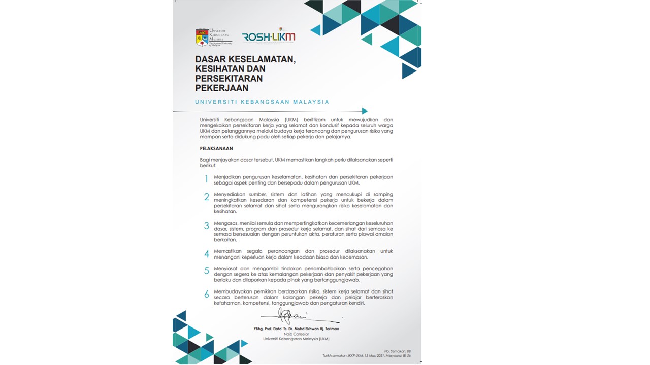 Universiti Kebangsaan Malaysia (UKM) beriltizam untuk mewujudkan dan mengekalkan persekitaran kerja yang selamat dan kondusif kepada seluruh warga UKM dan pelanggannya melalui budaya kerja terancang …