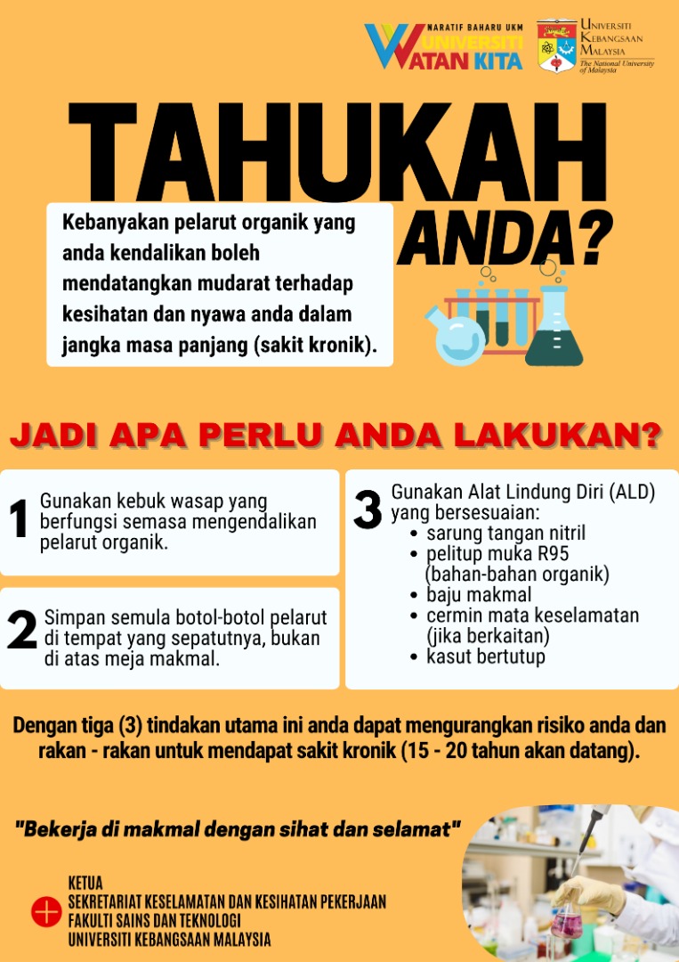 Ikuti langkah-langkah yang betul mengendalikan pelarut organik supaya tidak memberi kesan terhadap kesihatan & nyawa anda.