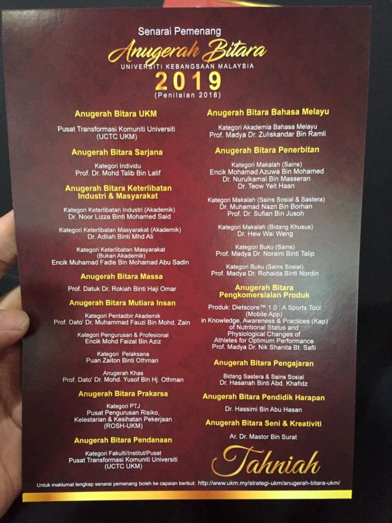 Komuniti Pegawai Sains UKM merasa bangga kerana 2 orang ahlinya berjaya terpilih sebagai pemenang Anugerah BItara UKM 2019.