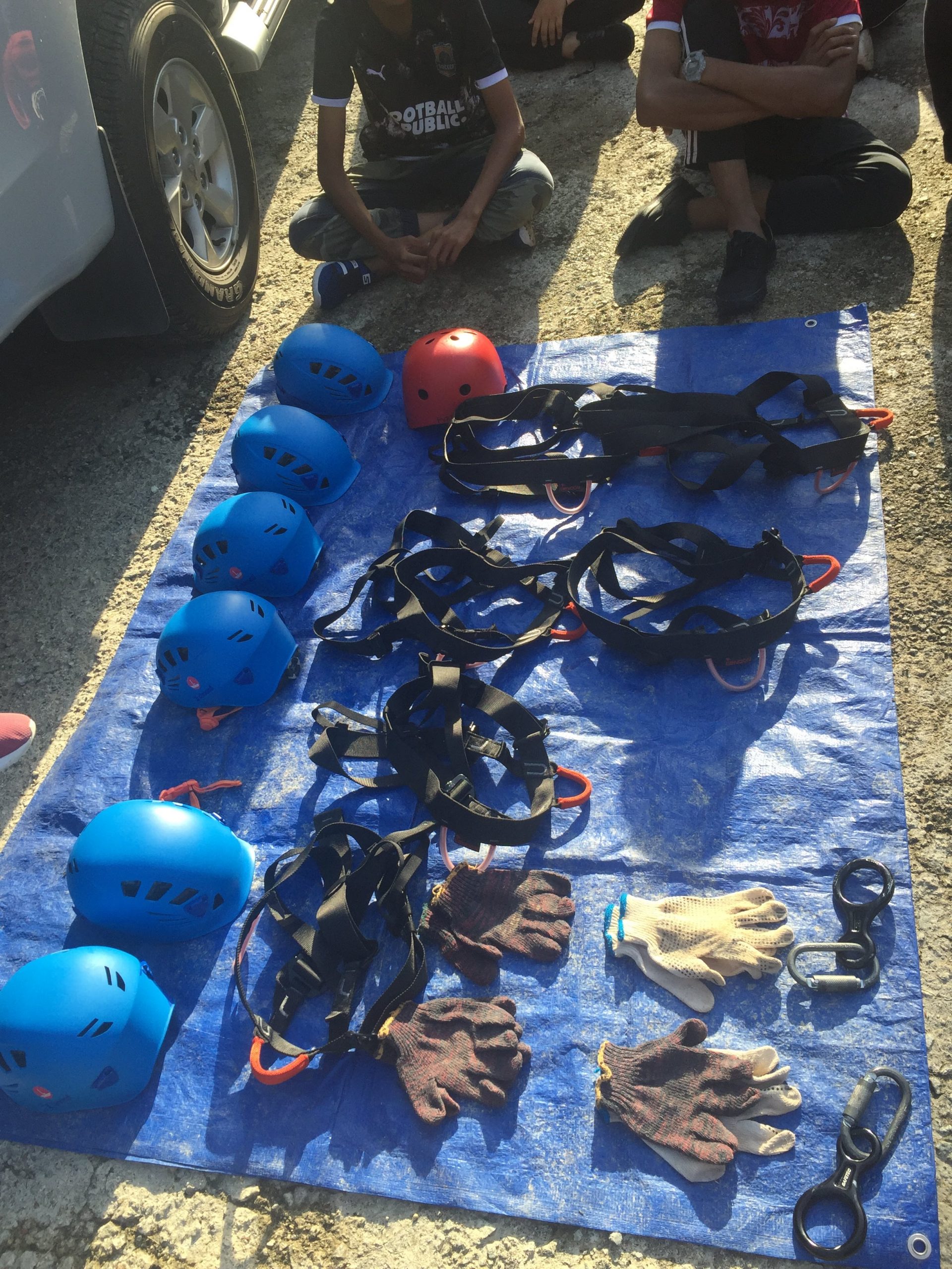 Peralatan abseiling diperkenalkan sebagai langkah keselamatan kepada peserta sebelum melakukan aktiviti tersebut.