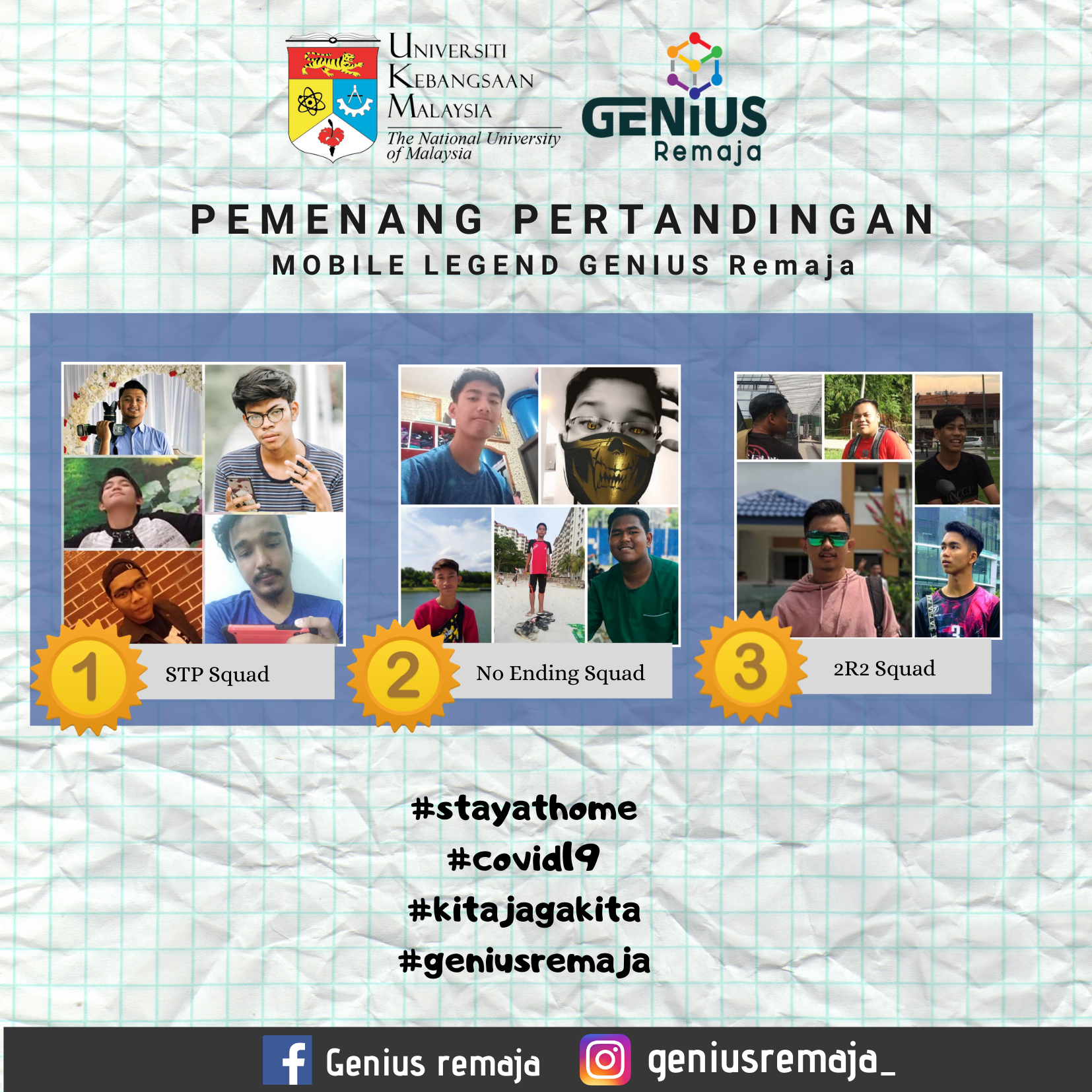 Kuala Lumpur, April 2020 - Esport merupakan sukan yang tidak memerlukan sentuhan fizikal untuk meraih kemenangan dan mendapat pengiktirafan oleh semua lapisan masyarakat. Oleh sebab itu, Pertandingan E-sport Mobile Legend telah dijalankan dalam talian pada 26 April 2020 dan telah mendapat sambutan yang menggalakkan dari semua peserta Pusat Komuniti GENIUS Remaja. Sebanyak lapan kumpulan yang mengambil bahagian dalam pertandingan ini. Pertandingan ini dianjurkan semasa Perintah Kawalan Pergerakan (PKP) dilaksanakan bagi mengisi masa peserta GENIUS Remaja dengan perkara yang berfaedah.