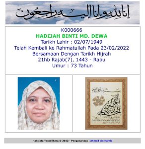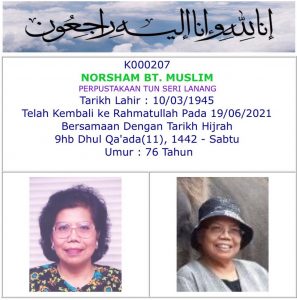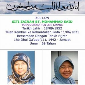 Khabar duka bahawa Dato Latifah Hj Hassan (ahli no. 395) telah berpulang ke Rahmatullah pada 30 Mac 2022.