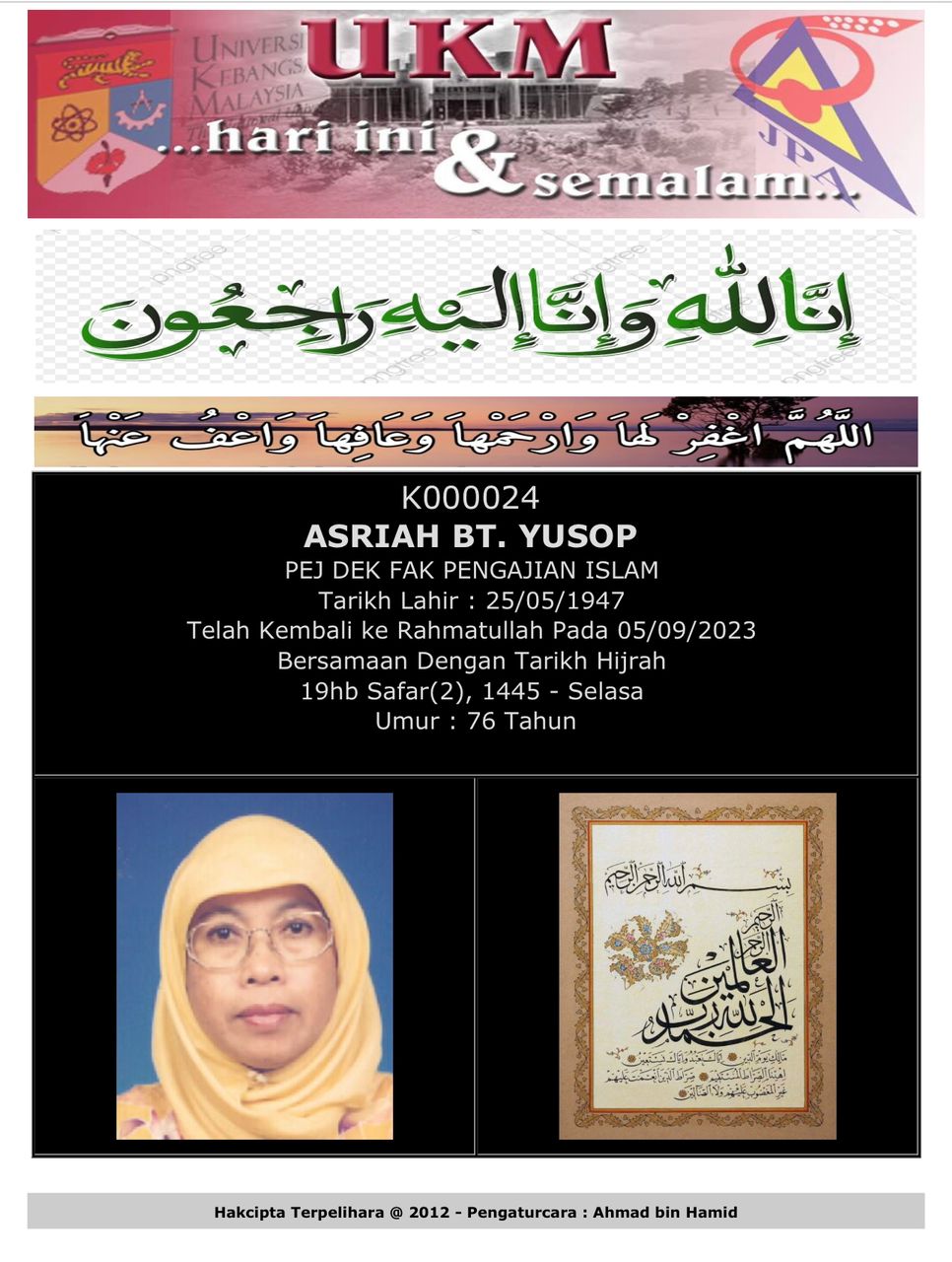 Dimaklumkan bahawa Sdr. Suhaimi (mantan juru telefonis UKM) telah berpulang ke rahmatullah pada 9 Mac 2014 dan telah selamat disemadikan di Tanah Perkuburan Islam Sg. Tangkas.