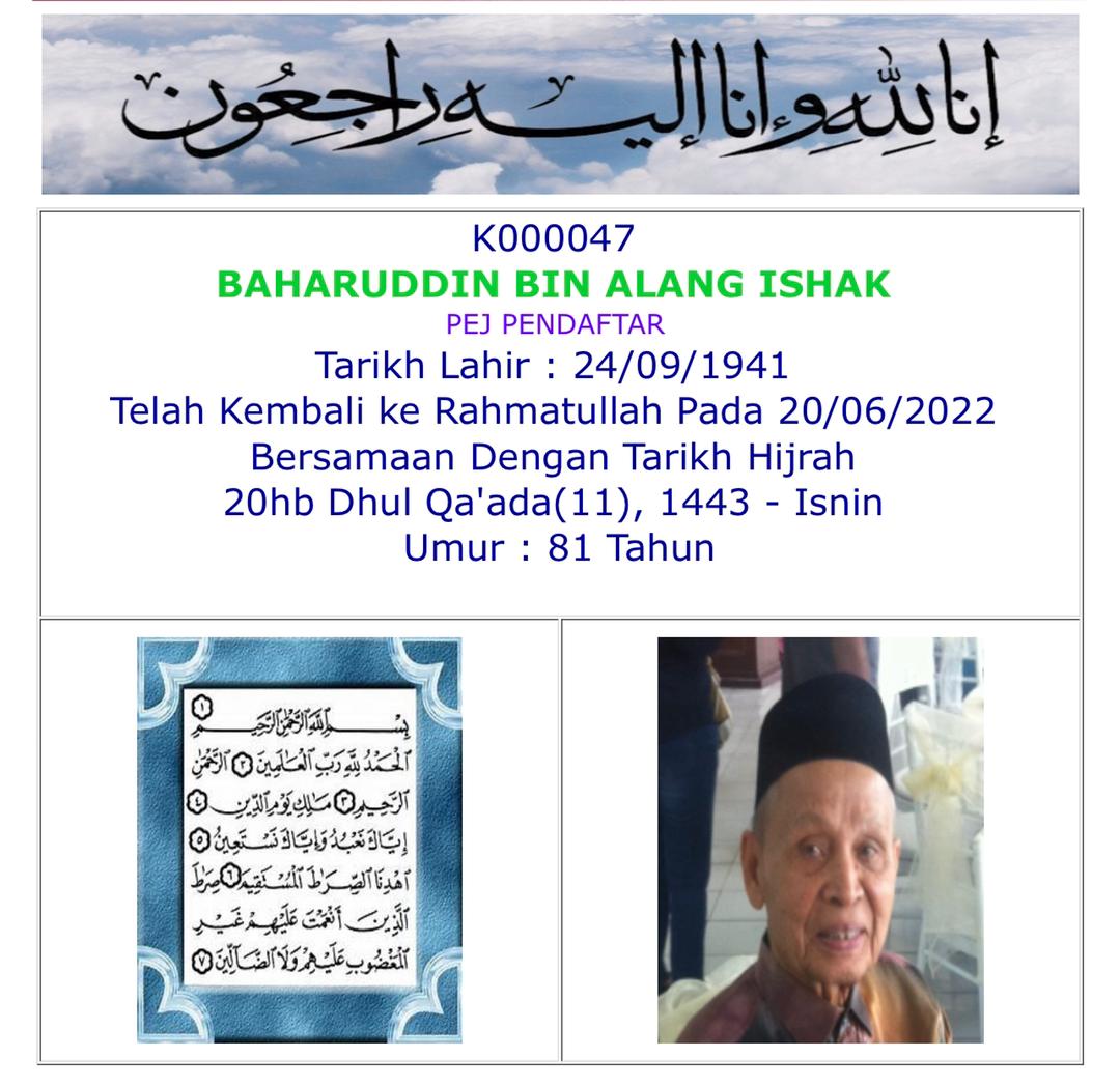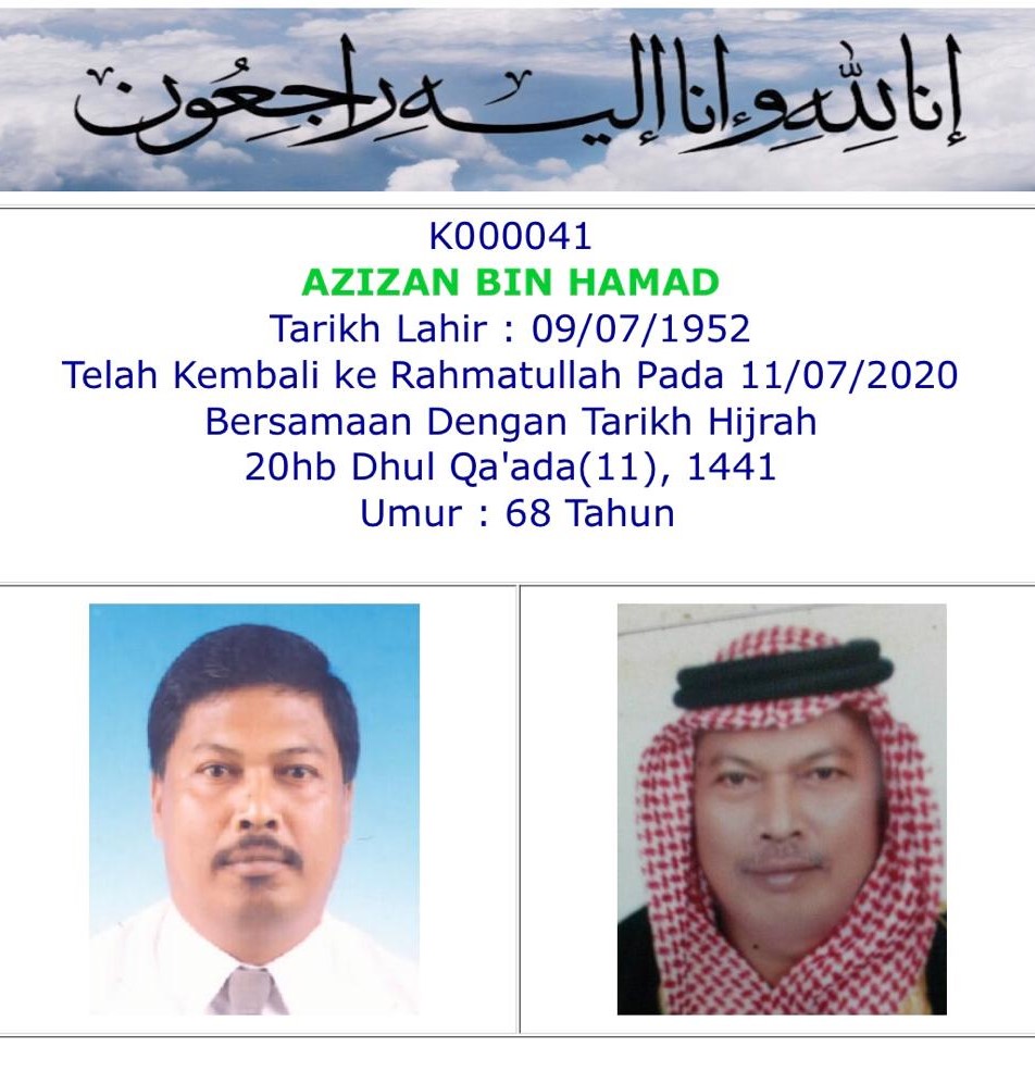 Takziah kepada keluarga Hj Mansoor Hj Ahmad (Ahli no. 119) di atas berpulangnya kerahmatullah isteri beliau Hjh Salamah pada 6 Mei 2015. Semoga roh Allahyarhamah ditempatkan dalam golongan orang-orang yang solehah. Amin.