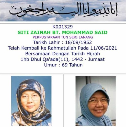 Khabar duka bahawa Dato Latifah Hj Hassan (ahli no. 395) telah berpulang ke Rahmatullah pada 30 Mac 2022.