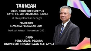 Tahniah Pengerusi Lembaga Pengarah UKM Tahniah kepada YBHG. Profesor Emeritus Dato’ Dr. Mohamad Abd. Razak di atas pelantikan sebagai Pengerusi Lembaga Pengarah UKM berkuat kuasa 1 November 2021