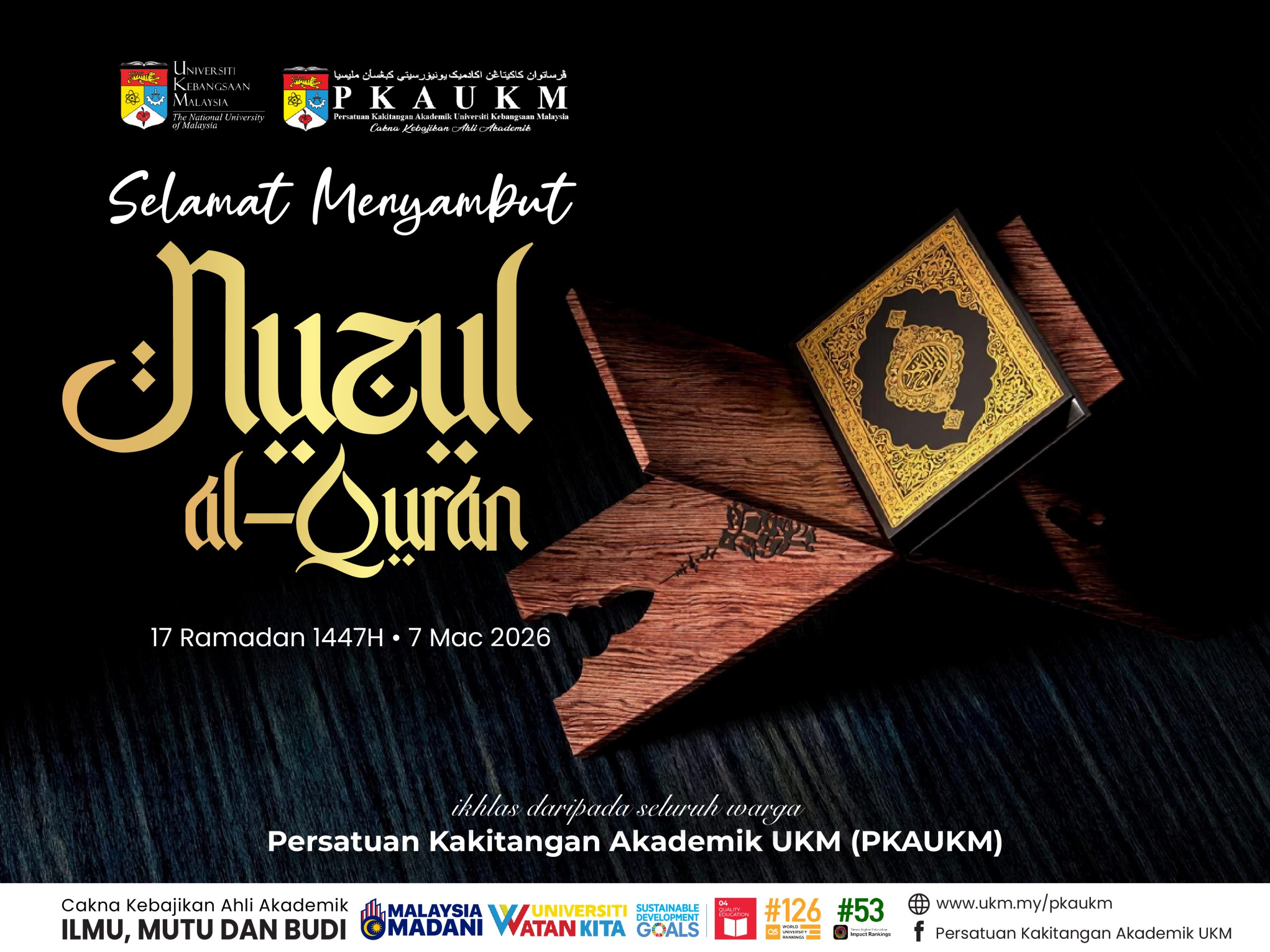 Persatuan Kakitangan Akademik UKM (PKAUKM) mengucapkan Selamat Menyambut Nuzul al-Quran bersamaan 17 Ramadan 1447H kepada seluruh umat islam khusunya warga PKAUKM.