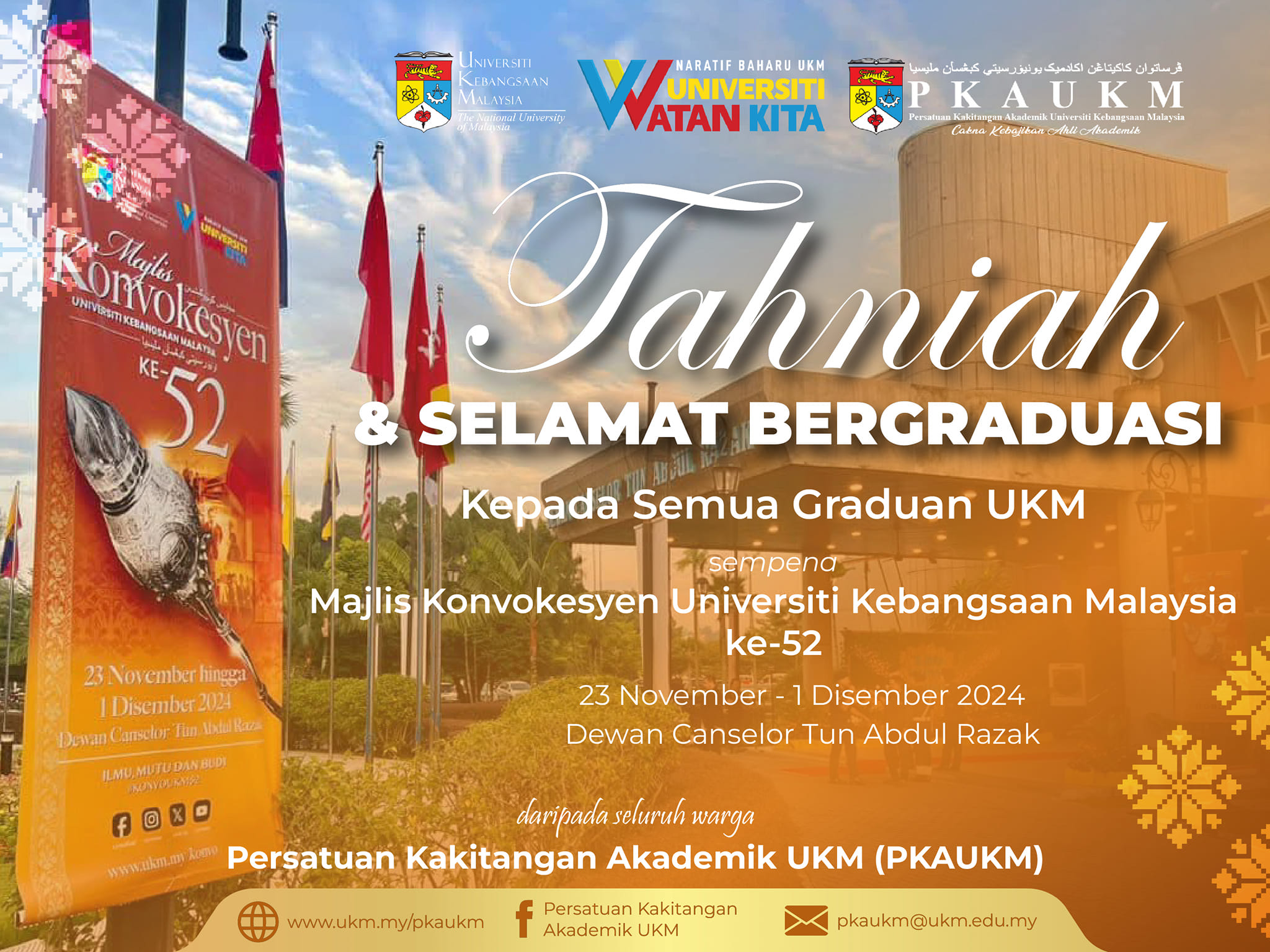 Tahniah dan Selamat Bergraduasi kepada Semua Graduan UKM TAHNIAH DAN SELAMAT BERGRADUASI Kepada semua graduan Universiti Kebangsaan Malaysia (UKM) sempena Majlis Konvokesyen UKM ke-52. daripada Persatuan Kakitangan Akademik UKM (PKAUKM) #konvoukm52 #GraduanUKM #UKM #UniversitiWatanKita #UniversitiKebangsaanMalaysia #PKAUKM #CaknaKebajikanAhliAkademik
